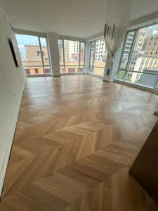 This project featured the installation of 4” White Oak Chevron flooring, adding a timeless and sophisticated pattern to the space. Three coats of Bona Traffic finish were applied, providing a durable, high-performance surface that enhances the wood’s natural beauty and ensures long-lasting protection.