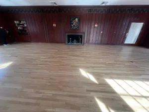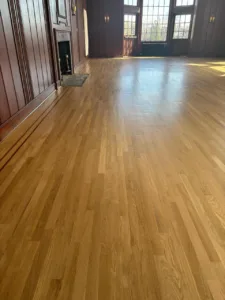 This project at New Haven Lawn Club featured the expert installation and finishing of 2 1/4″ SWO flooring, enhanced with a mahogany feature strip and intricate French knot detailing, adding elegance and craftsmanship to the space.